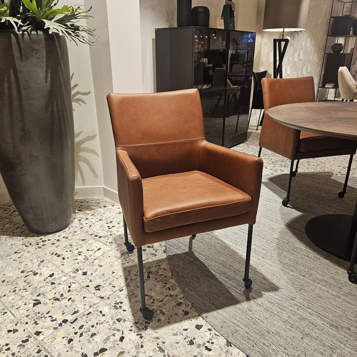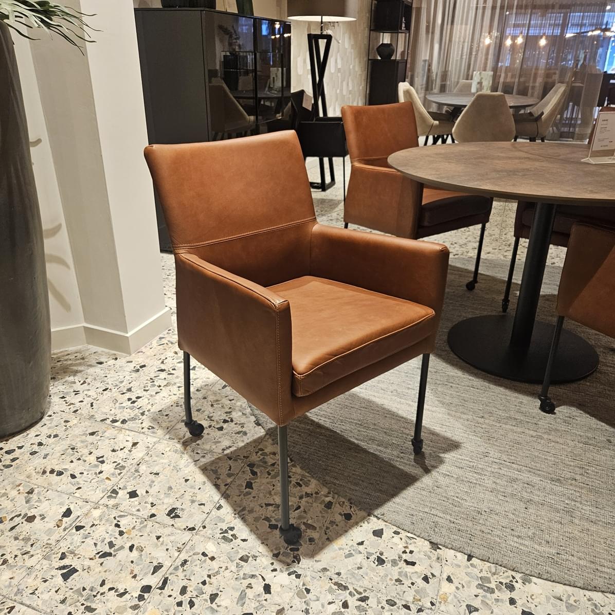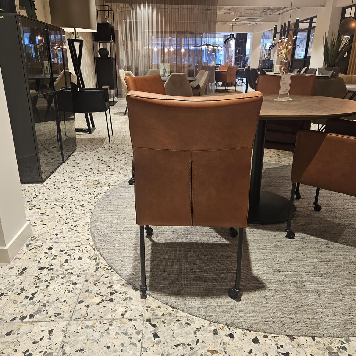 De eetkamerfauteuils hebben zwarte pootjes met een skatewiel. Gestoffeerd in leer rancho cognac, een stoer stuk tuig leer met een lekkere touch.