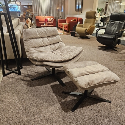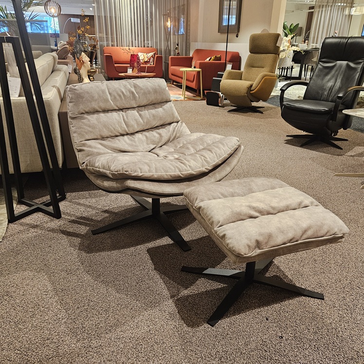 De kameraad met de lage rug hebben we als showroom model afgeprijsd. De fauteuil is in de mooie rijke velours stof gestoffeerd. Doormiddel van het bijgeleverde voetenbankje kom je de avonden wel door.